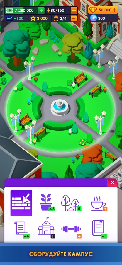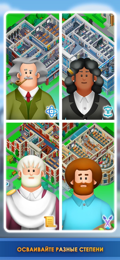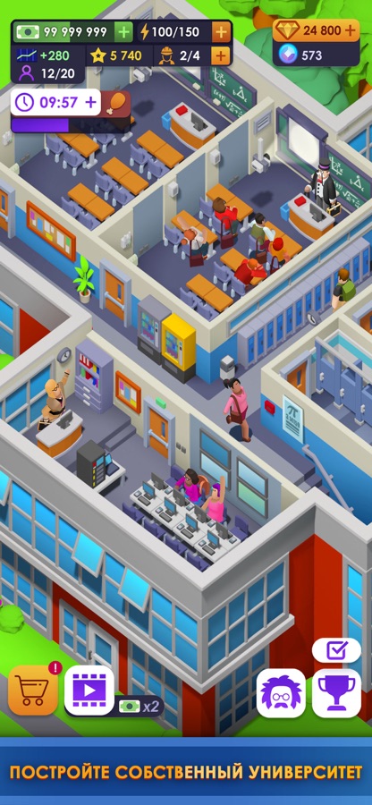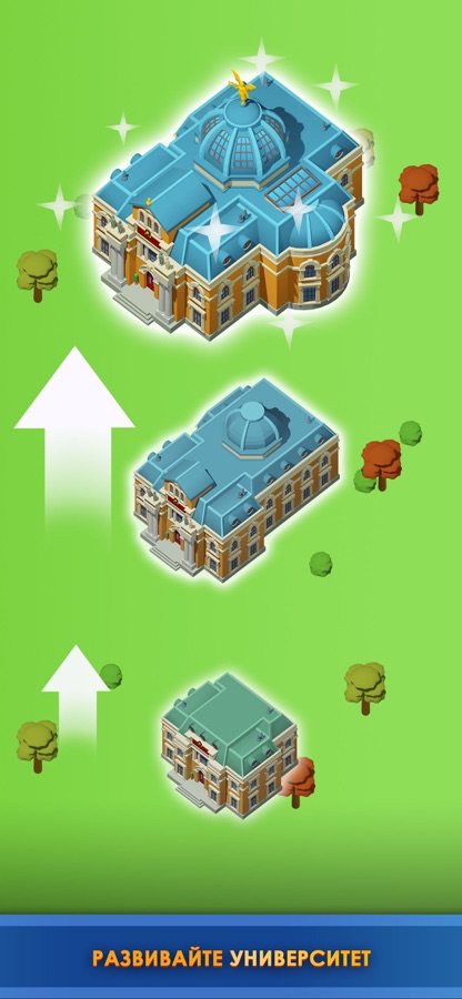 Добавляйте новые зоны на территории университета! Стройте новые классы, спортивные центры и административные помещения. Открывайте зоны отдыха, студенческие клубы, баскетбольные площадки. Покупайте самые современные учебные материалы и открывайте новые факультеты, улучшая образовательную программу по многим предметам: математике, праву, медицине, философии, литературе, физике, химии, инженерному делу… Старайтесь развивать крупнейший университетский городок с умом, чтобы достичь уважения и статуса, которого вы заслуживаете. Изучите ситуацию, оцените свои возможности и разумно вложите прибыль!