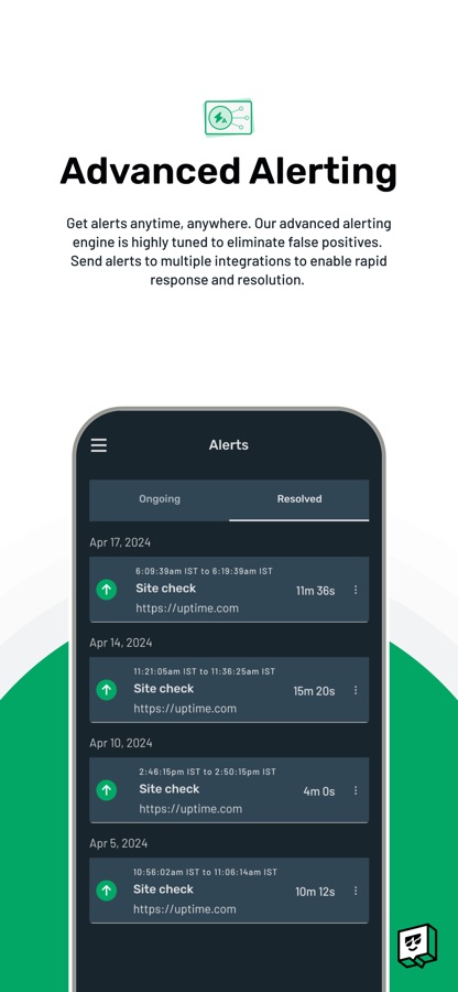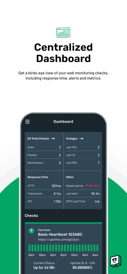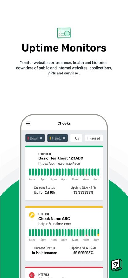 Uptime checks your website at one-minute intervals from 30 different locations across 5 continents. From our app, you can access your active checks, pause or resume a check, and access alert details.