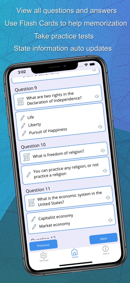 Unlike other apps, US Citizenship Test App allows you to select your state, updating the flash cards and practice test to include your state information (governor, senators, representatives) that you need to know for the USCIS Test.