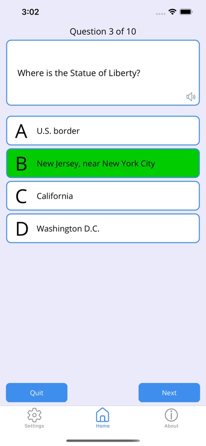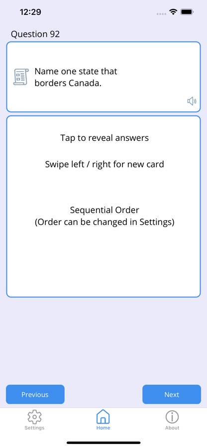Use this app to learn the answers for all the questions and actually practice the USCIS Citizenship Civics Test. Features flash cards for all 100 questions. View them in a random order, or the order presented in the USCIS documentation. Take a practice test and see if you can score well enough to pass the actual Interview Test. Also includes audio for all questions and answers so you can hear the questions read aloud as you study.