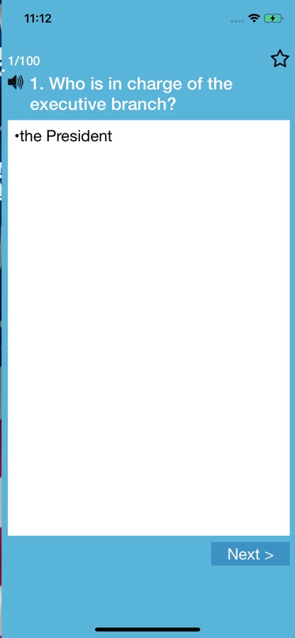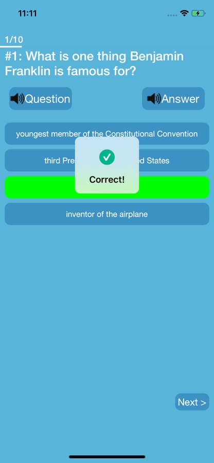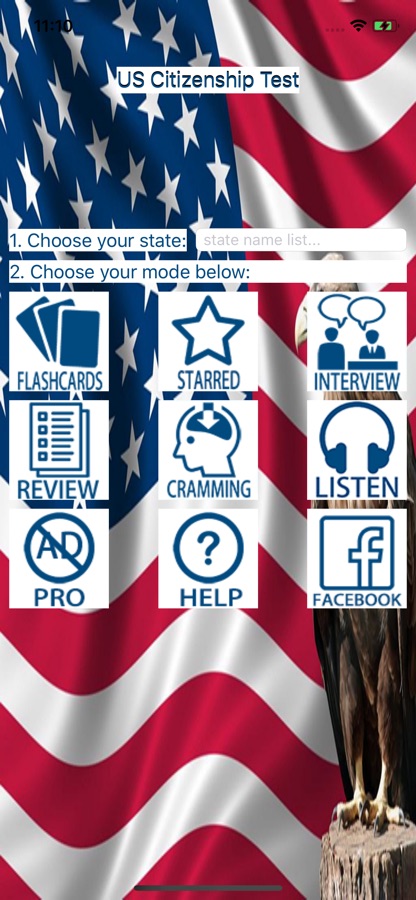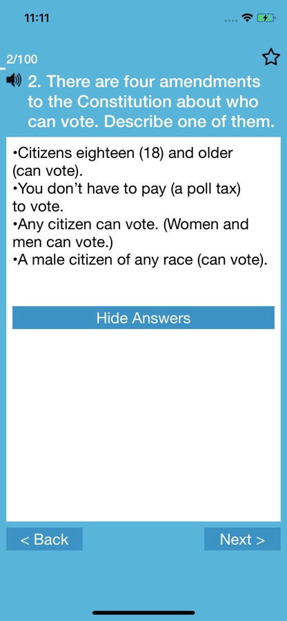 -FLASHCARDS mode: study the citizenship test questions by hiding the answers until you reveal them.