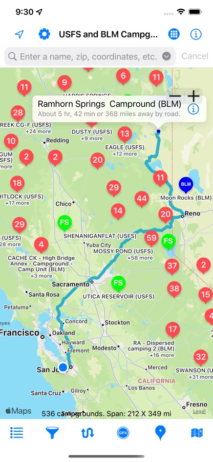 This app shows over 5,640 United States Forest Service (USFS) and Bureau of Land Management (BLM) campgrounds throughout the USA.