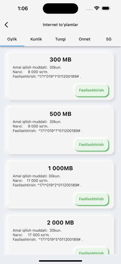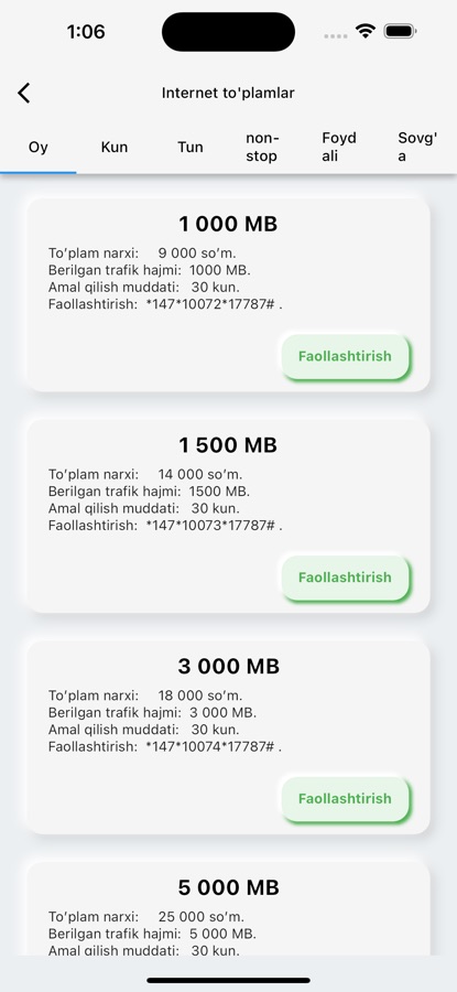 — Internet Paketlari: Operatorlar uchun mavjud bo’lgan turli hajmdagi internet paketlari va ularni faollashtirish uchun USSD kodlar.