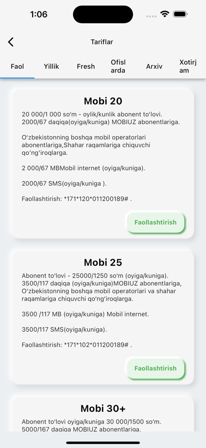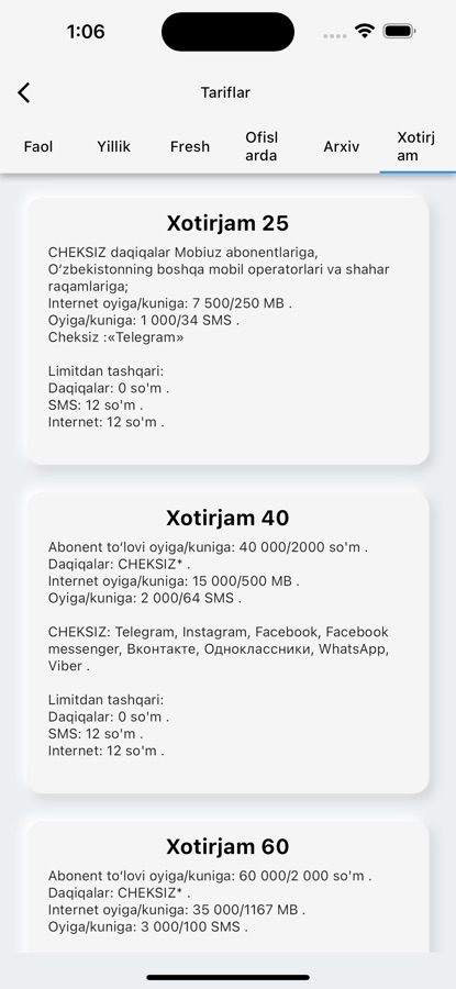— Tarif rejalari: Foydalanuvchilar operatorlarning turli tarif rejalari va ularning tafsilotlari haqida ma’lumot olishlari mumkin.
