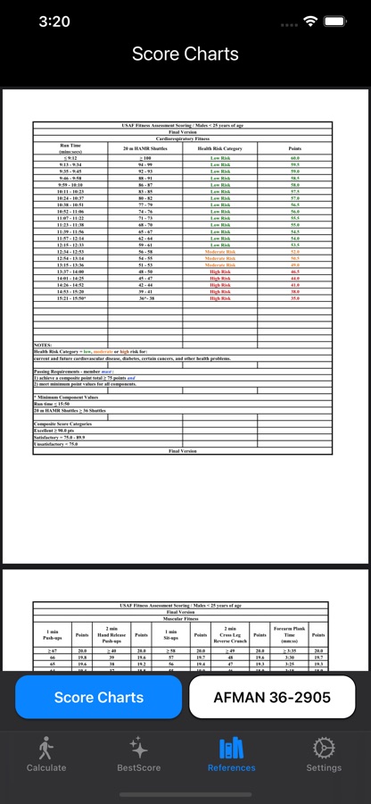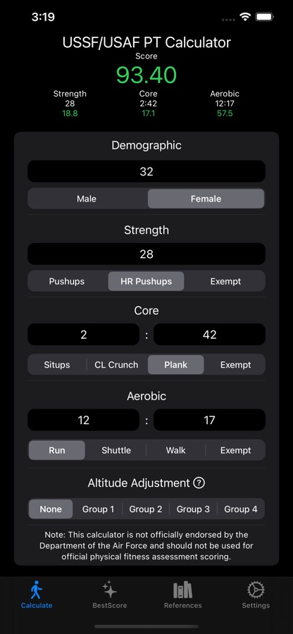 ***This app is not official and should be used for reference purposes only. Scoring should be verified against official Air Force/Space Force Fitness Assessment scoring guidelines***