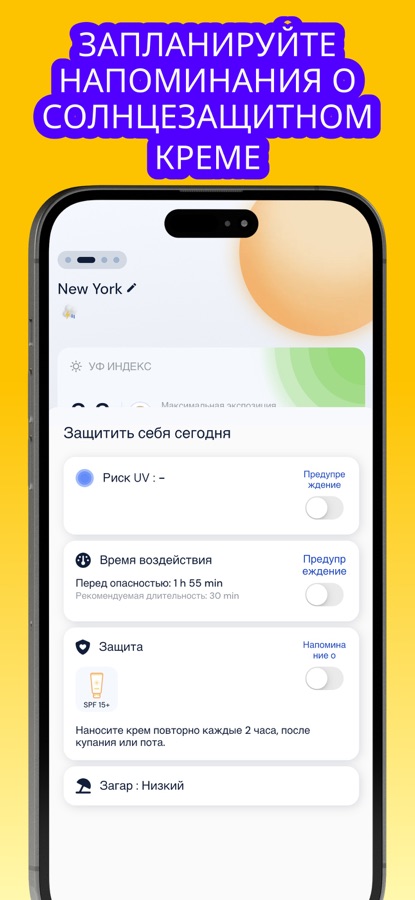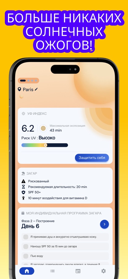 Наше приложение для отслеживания солнечного излучения — самое полное решение для всех, кто заботится о безопасном загаре, солнцезащитном креме и мониторинге УФ-индекса в режиме реального времени. Независимо от того, хотите ли вы получить золотистый загар, контролировать свой режим использования солнцезащитного крема или защититься от солнечных ожогов, это приложение предоставит вам все необходимое каждый день.