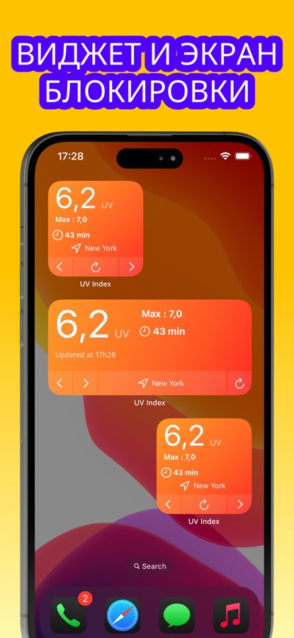 Виджет прогноза УФ-излучения для загара, использования солнцезащитного крема, защиты от солнца и пребывания на открытом воздухе.