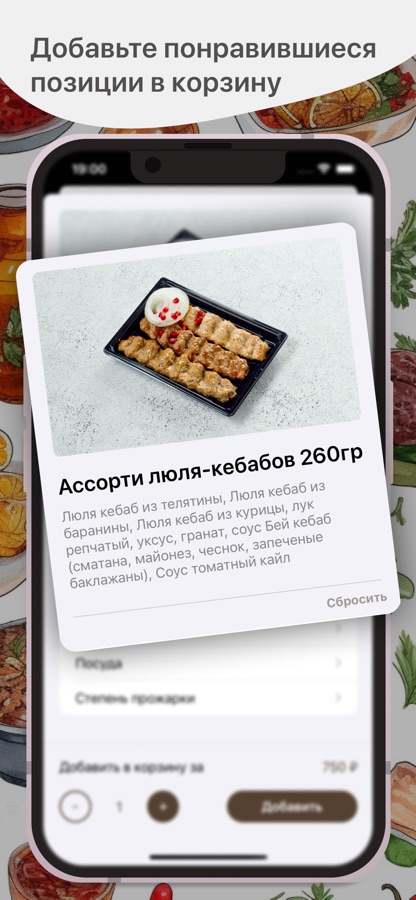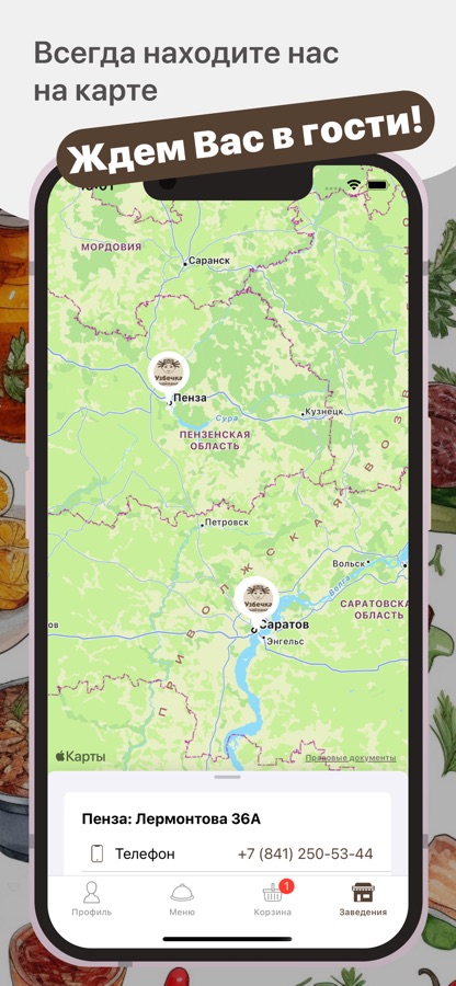Как сделать заказ в приложении “Узбечка”: выберите понравившиеся позиции из меню, добавьте их в корзину и перейдите на экран оформления заказа (по нажатию на иконку корзины).
