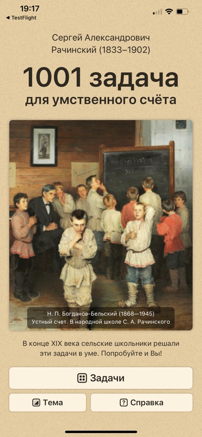 Приведены задачи из книги С.А. Рачинского «1001 задача для умственного счёта». Работа в уме с числами оказывает очень благоприятное влияние на развитие мозга человека. Наличие в пути iГаджета и отсутствие листочка позволит Вам заняться умственной гимнастикой. В конце XIX века сельские школьники успешно решали эти задачи в уме. Попробуйте и Вы!