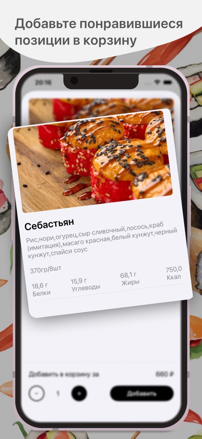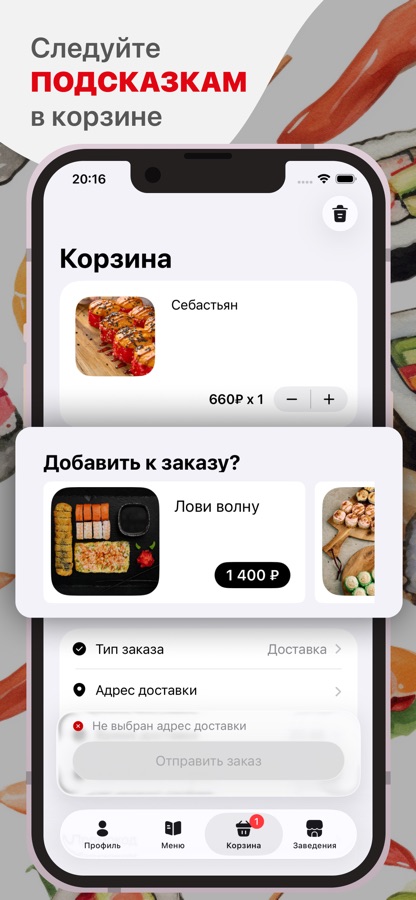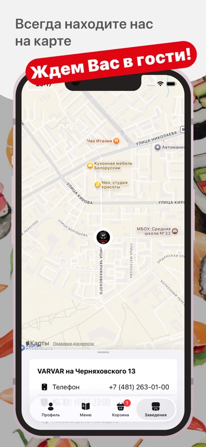 Как сделать заказ в приложении “VARVAR SUSHI”: выберите понравившиеся позиции из меню, добавьте их в корзину и перейдите на экран оформления заказа (по нажатию на иконку корзины).