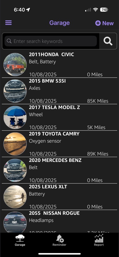 *Manage maintenance records for multiple vehicles—oil changes, brakes, tires, batteries, and more.