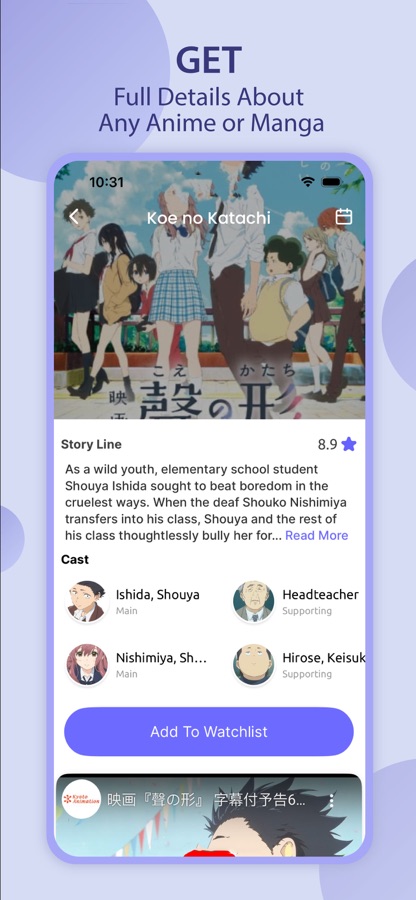 — Discover Anime and Manga : Users can explore a vast collection of anime and manga titles within the app. It provides comprehensive information about each title, including synopses, cast details, genres, and more.
