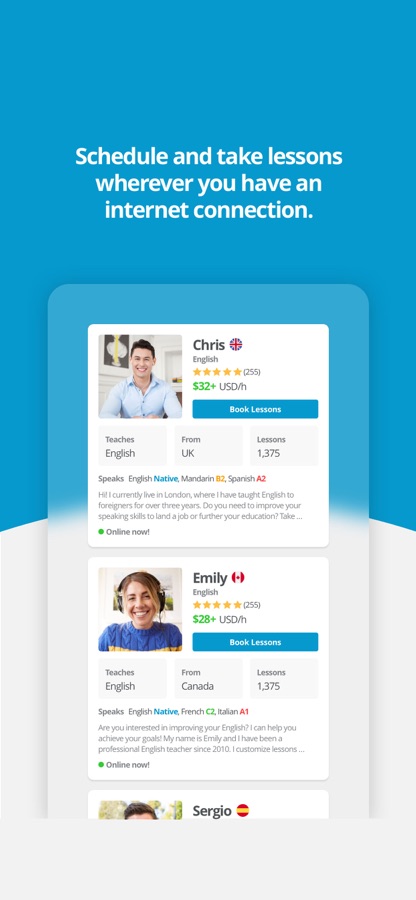 Учите английский, испанский, французский, немецкий, португальский, итальянский, японский, китайский, арабский и многие другие языки, используя видеочат для общения с учителями со всего мира.