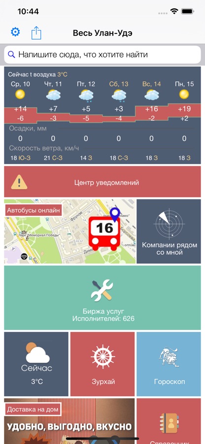 Больше 25 интереснейших и полезных разделов, смотрите сами: доставка еды на дом, бесплатная доска объявлений, расписание общественного и междугороднего транспорта, афиша, зурхай, акции и скидки, новости Улан-Удэ, Бурятии и мира, расписание кинотеатров… Справочник организаций с голосовым навигатором….