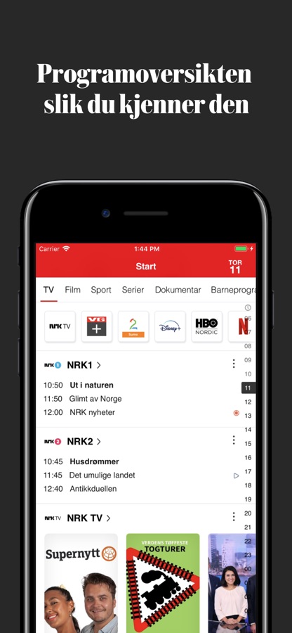 På startsiden får du rask oversikt over hva som går på TV og hva som er nytt hos streamingtjenestene. Du tilpasser siden enkelt inne på “Min side”. Vi har alle de mest populære streamingtjenestene som for eksempel Netflix, HBO Nordic, TV2 Sumo, Dplay, Viaplay, Disney+, Viafree, AppleTV+, Cmore og Itunes, og flere enn 200 TV-kanaler å velge mellom. Både de streamingtjenestene og TV-kanaler kalles kanaler hos oss, og inne på “Min side” kan du legge til og fjerne kanaler eller bytte om på rekkefølgen de vises i på startsiden.