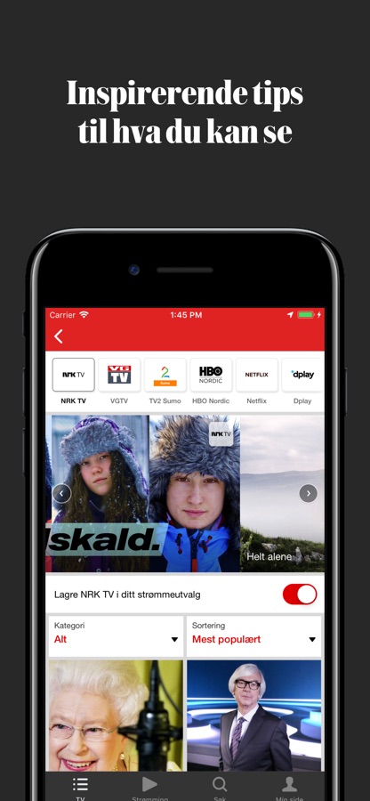 Her finner du inspirasjon og oversikt over alle filmer og serier fra en rekke streamingtjenester. Du kan se hva som er nytt, mest populært og høyest vurdert. På denne siden kan du også velge hvilke du abonnerer på og kun se innhold fra dem om du ønsker det.