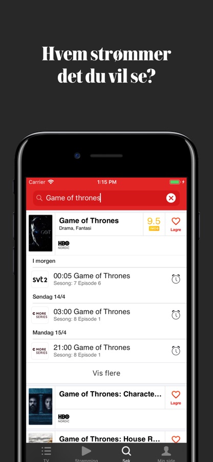 Få oversikt over hvilke streamingtjenester som viser programmet eller filmen du ønsker å se, klikke deg direkte inn til streamingtjenesten hvor du kan se programmet eller filmen på mobilen eller for eksempel på din TV via Cromecast eller Airplay.