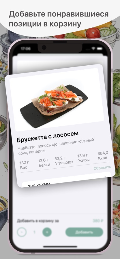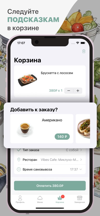 Как сделать заказ в приложении “Vibes Cafe”: выберите понравившиеся позиции из меню, добавьте их в корзину и перейдите на экран оформления заказа (по нажатию на иконку корзины).