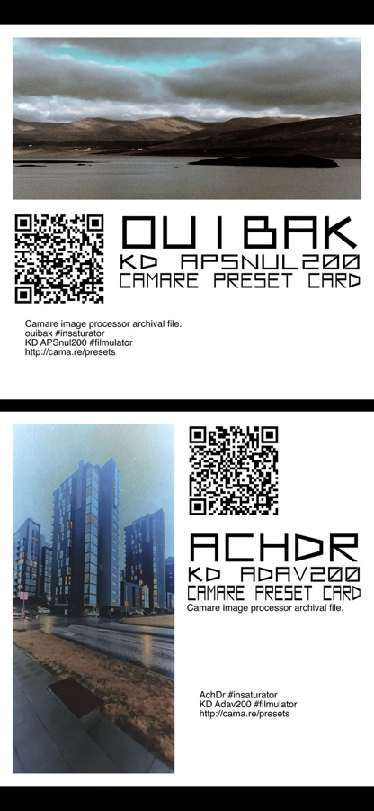 Почувствуйте рабочий процесс аналоговой фотографии с цифровыми пленками, контактными листами и почти бесконечным количеством современных экспериментальных/творческих фильтров, которые можно поделиться с помощью QR-кодов.
