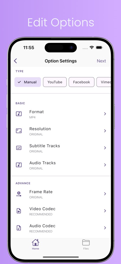 • Advanced mode to specify video bitrate, Custom resolution, Custom FrameRate ,audio bitrate, etc.