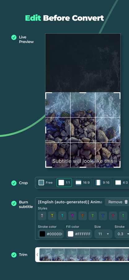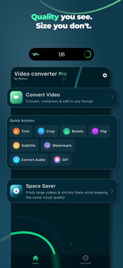 Конвертируйте видео в 20+ форматов, сжимайте для экономии памяти, извлекайте аудио, создавайте GIF-анимации и редактируйте — все прямо на устройстве, без загрузки в облако.