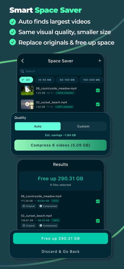 Автоматическое сканирование медиатеки на наличие больших видео и сжатие без удаления оригиналов. Выберите легкое, среднее или сильное сжатие. Оцените экономию места до начала обработки. Прерванные сессии продолжаются с того места, где остановились.