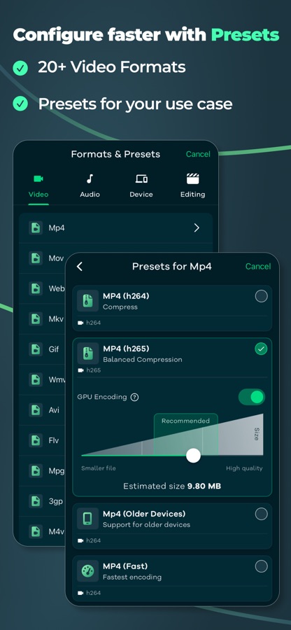 Оптимизированные пресеты для Final Cut Pro, After Effects, iMovie и InVideo. Пресеты сжатия с легким, средним и сильным уровнем. Пресеты разрешения от 4K до 144p. Варианты с приоритетом скорости или качества. Поддержка HDR.