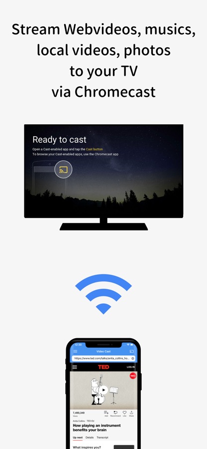 Stream any webvideos, musics, local videos/photos to your Chromecast Device to enjoy watching on your big screen TV.