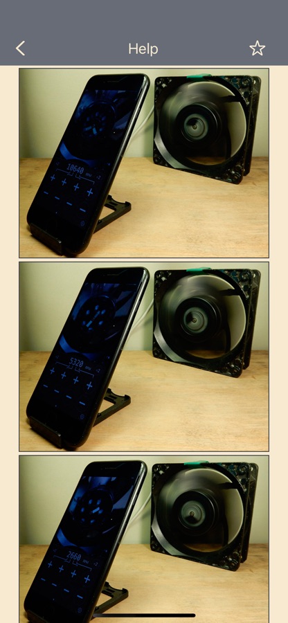 Для более удобного наблюдения изменений скорости вращения можно включить подсказки. Подсказки показывают как изменять частоту кадров (уменьшать или увеличивать) в зависимости от направления вращения метки. Подсказки выбираются вручную, но после этого не нужно запоминать эту информацию. Подсказки актуальны для частот близких к частоте вращения. Зная направление вращения крыльчатки, подсказки можно выбрать заранее. Стрелка показывающая направление вращения крыльчатки должна соответствовать кнопке «+».
