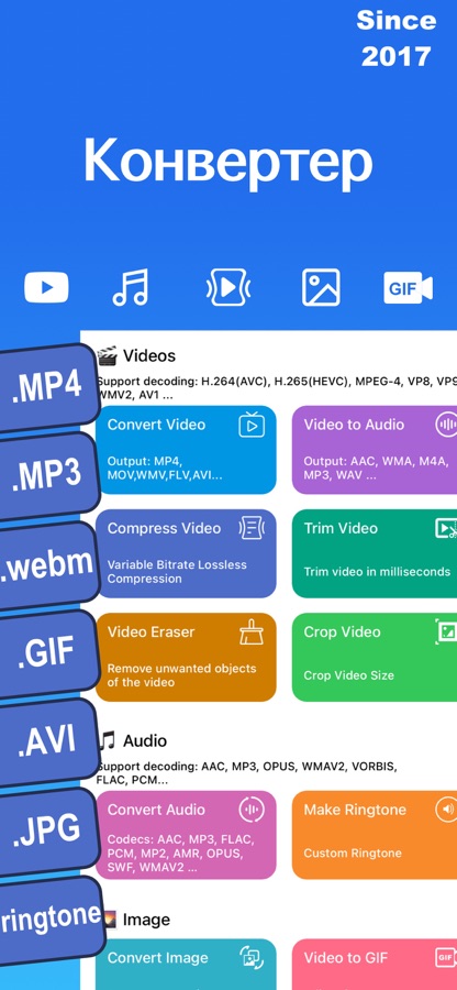 Конвертируйте видео, аудио и изображения, сжимайте видео, извлекайте аудио и создавайте собственные рингтоны с музыкой.