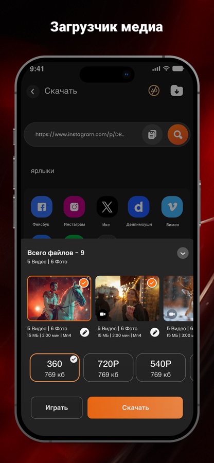 Автоматически сканирует и систематизирует медиафайлы с вашего устройства. Легко добавляйте файлы из приложения «Файлы», создавайте папки и сортируйте медиафайлы.