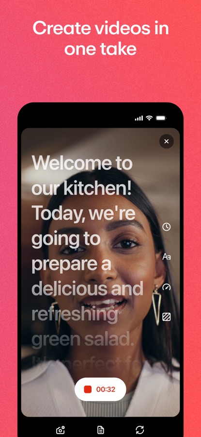 AI-powered video tools for one-take video creation: Create savvy scripts in seconds with AI script generation, capture content right from your iOS device with a built-in teleprompter, and do it all in one take, thanks to video editing that’s as simple as editing text.
