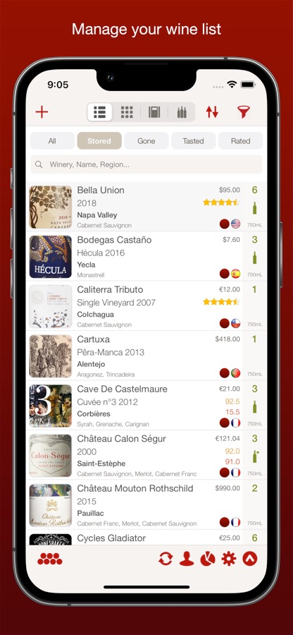 VinoCell is the most complete app to manage your wine list, graphically display your cellar, to record both your tastings and pro ratings and to match dishes to your wines.