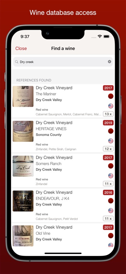 — Text search in the 175.000 wine database with labels — or add your wines manually but quickly using the internal country, region, appellation and varietal database.