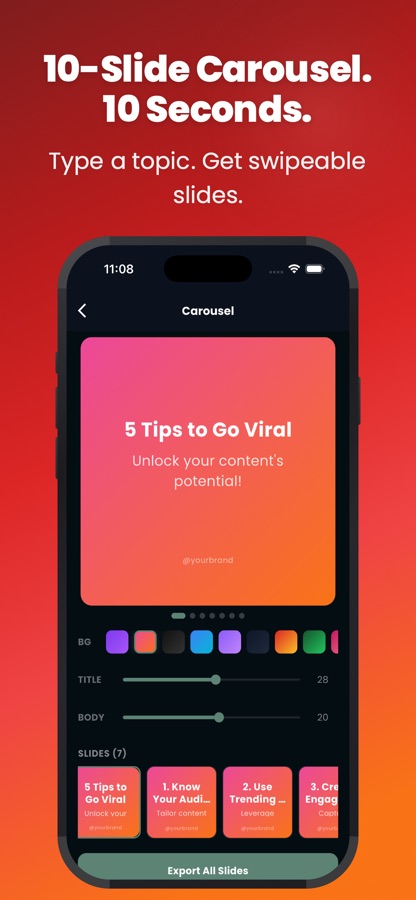 Enter a topic, AI creates a full carousel — title slide, content slides, and CTA. Multiple templates. Export all slides at once.