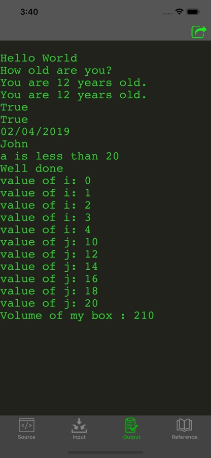 — This is a batch compiler; interactive programs are not supported. For example, if your program provides an input prompt, enter the input in the Input tab prior to compilation.