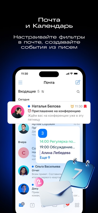 Корпоративная почта и Календарь. Интеграция с доменом компании, треды писем, совместный доступ к папкам и почтовым ящикам. Рабочее пространство для планирования встреч: файлы в событиях, ссылки на звонки, уведомления.