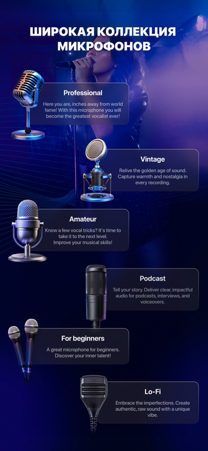 Обширная коллекция микрофонов: Винтажный, Lo-Fi, Подкаст, Профессиональный, Любительский и для начинающих.
