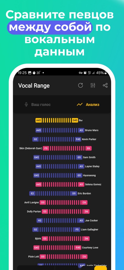 Узнайте свой тип голоса и сравните свой диапазон с известными певцами.
