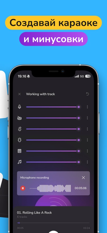Вы сможете записать свой вокал под любую созданную минусовку. Мы также добавили возможность слышать себя в наушниках во время записи.