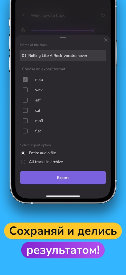 С Vocal Remover AI профессиональное извлечение вокала и музыки осуществляется всего в несколько касаний. Вытащить голос или любой инструмент из трека теперь очень просто. Приложение станет идеальным инструментом для создания минусовок и караоке, а также поможет попрактиковаться при разучивании партий на музыкальном инструменте.