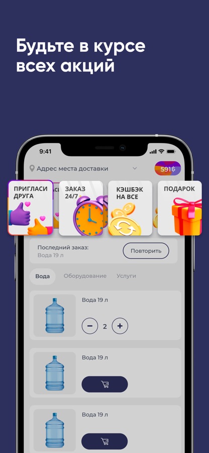 Скачайте приложение Вода Арт на свой смартфон и делайте заказ воды 24/7. Вы сможете повторять заказ нажатием одной кнопки, видеть всю историю покупок и быть в курсе всех акций компании.