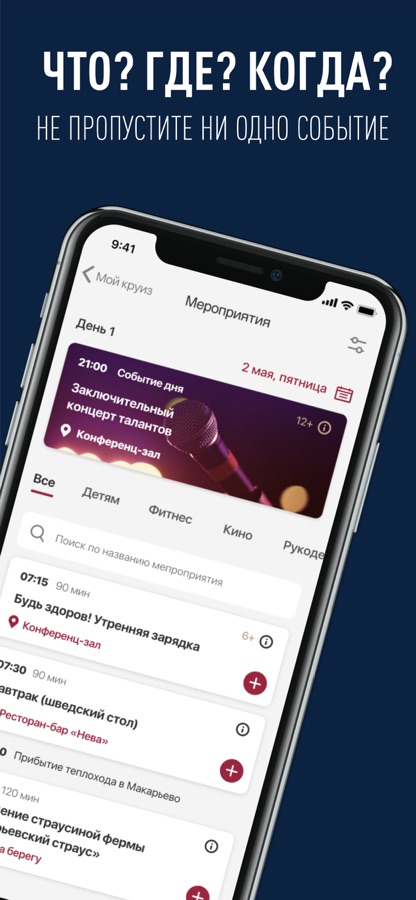 Мы знаем, как вам важно иметь все подробности своего путешествия под рукой. Здесь вы найдете программу дня с программой мероприятий: экскурсии, остановки, расписание ресторанов, главные ивенты на теплоходе. Вы можете добавить в свой персональный календарь мероприятия, которые планируете посетить.