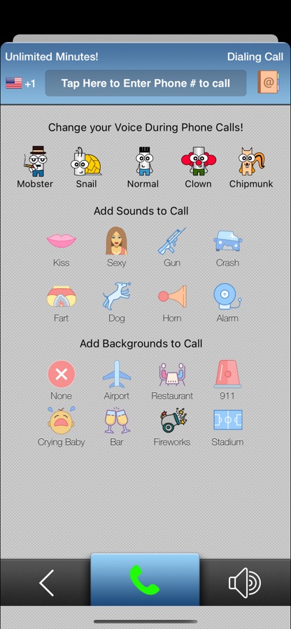 Измените свой голос во время телефонного звонка, чтобы скрыть свою личность! Добавьте различные фоны к своему звонку, чтобы представить, что вы находитесь в ресторане, на футбольном матче или даже сидите с детьми! Добавляйте живые эффекты, такие как пукание, поцелуи и даже автокатастрофы!