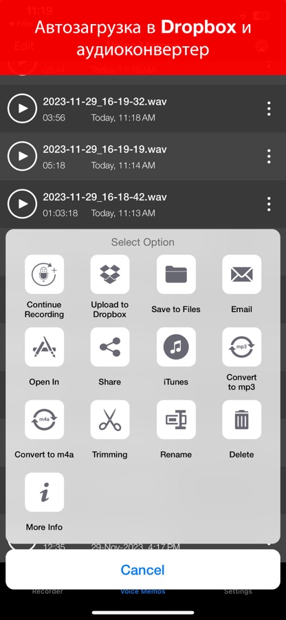 Вы можете автоматическую загрузку и даже разделить запись на облаке (Dropbox) в секундах.