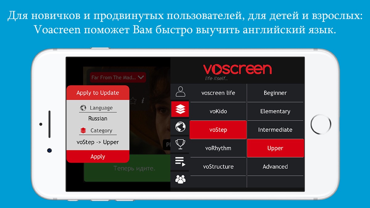 • В меню voStep вы можете выбирать видеоклипы от начинающих изучать язык до продвинутых, чтобы вы сосредоточились на вашем собственном уровне английского.