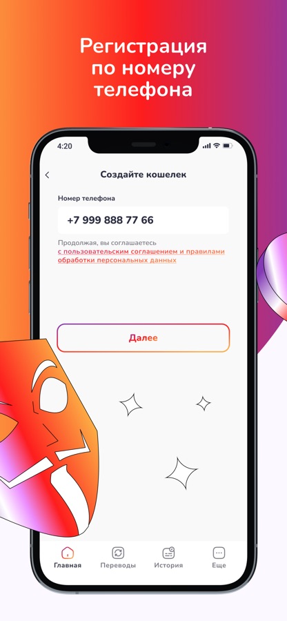 • Простая регистрация: мгновенный доступ к кошельку через номер телефона.