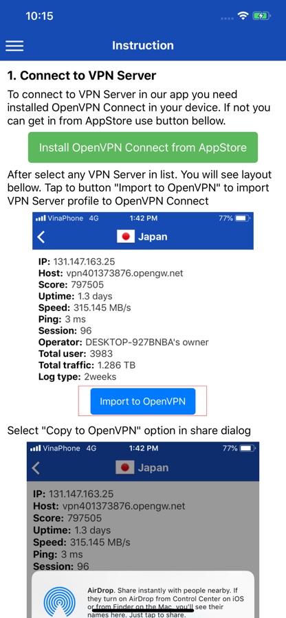 You can connect any VPN Server in application by import VPN server profile to third party app (OpenVPN Connect). Sometime some server can’t access but don’t worry you can choose another server to connect. Because VPN Server come from volunteer it may provide use their personal computer so sometime it’s unavailable to connect. You can choose VPN Server with long uptime it often available to connect.