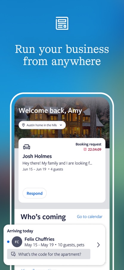 The Vrbo Owner Mobile App makes it easy to manage your vacation rental. Stay connected with travelers, manage your bookings, and run your business, anytime and anywhere.