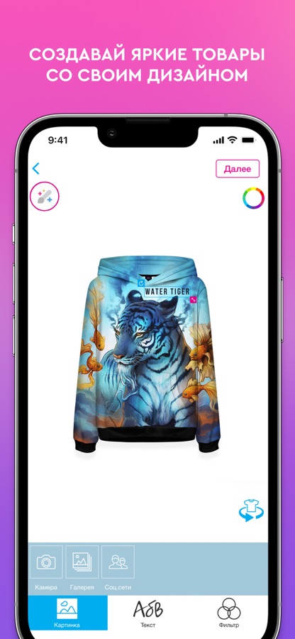 Приложение Vsemayki — создавайте одежду со своим оригинальным дизайном, используя удобный конструктор товаров, применяйте фильтры и рамки, делайте оригинальные надписи.